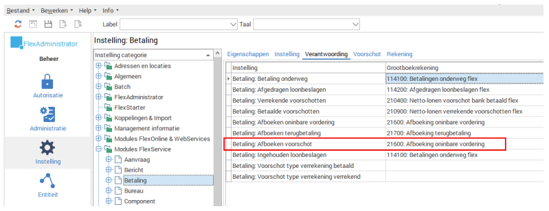 Zorg er dus altijd voor dat de verantwoording van de afboeking van voorschotten op een ander grootboek dan de terugbetaling/oninbare vorderingen staat. In de FlexAdministrator kan je bij domein > Grootboekrekening een nieuw grootboekrekeningnummer aan maken. Deze kan je vervolgens koppelen aan de instelling in de bovenste afbeelding.