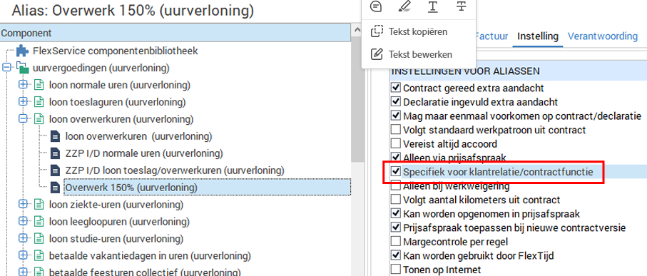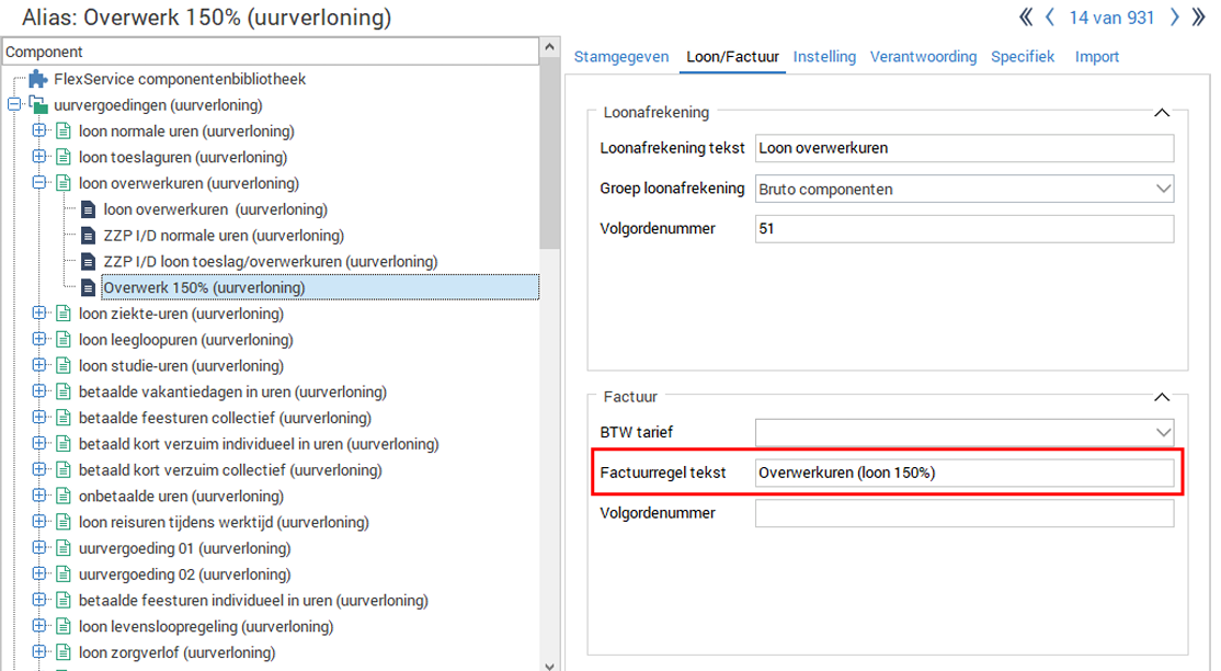 Er moeten drie dingen ingeregeld worden in deze casus (naast het op de juiste wijze aanmaken van een alias / parameteriseren in het model). In tab Loon/Factuur kun je bij Factuurregel tekst de exacte benaming aangeven zoals de klant die op de factuur wenst.