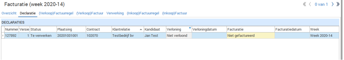Op het moment dat je nu een declaratie op Te Verwerken zet wordt deze ook getoond in module Facturatie, tab Declaratie. Hier staan normaliter de ZZP en Inleen-Doorleen declaraties klaar voor facturatie (immers, die worden niet verloond). De declaratie die je eerst wil factureren en daarna pas wil verlonen wordt hier ook klaar gezet. Vanuit deze tab verwerk je de regels met de knop 'Verwerken' onderin het scherm tot Verkoop factuurregels, waarna je regels op de gebruikelijke manier verder verwerkt tot een factuur.