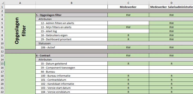 Er opent nu een Excel sheet, met daarin per rol de bijbehorende inrichting.