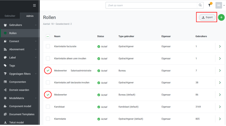 Hieronder een voorbeeld waarin we de rol van Medewerker Salarisadministratie willen vergelijken met de rol van Medewerker. Ga naar Admin/Rollen en selecteer de rollen die je met elkaar willen vergelijken door deze rollen aan te vinken. Klik daarna op de knop Export, rechts bovenin.