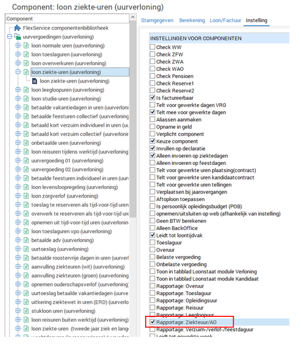 MI rapport 3006 UOM kandidaat, declaratie (Export) wordt geëxporteerd naar een Excel bestand. In kolom “Uren Ziek” worden alle uren op declaratieniveau getoond die vallen onder het component wat gemarkeerd is op onderstaande manier. Omdat deze informatie tot kandidaat-declaratie niveau gedetailleerd is kun je hier heel nauwkeurig over ziekte rapporteren. Het Excel bestand kan je bewerken naar wens, door bijvoorbeeld een kolom te filteren op de informatie die je nodig hebt.
