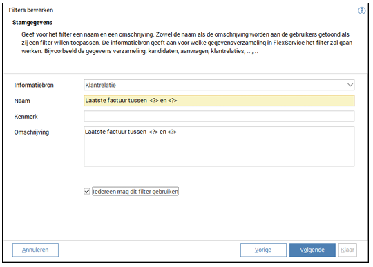 Het filter is nu te gebruiken. Als je in module Klantrelatie op klikt, of je toetst F4 dan krijg je het overzicht van de aanwezige filters. Deze nieuwe staat er nu ook tussen. Als je deze kiest krijg je een pop-up waarin je de twee datums op kunt geven. Om nu je actuele klanten uit te filteren geef je bijvoorbeeld onderstaande datums op. Na het aanklikken van OK zie je in FlexService rechts bovenin het aantal klanten wat een laatste factuur heeft gekregen tussen deze twee datums.