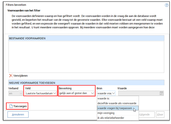 Stel nu het filter samen. Kies voor Laatste factuurdatum – gelijk aan of groter dan – waarde vragen bij toepassen. Klik op Toevoegen.