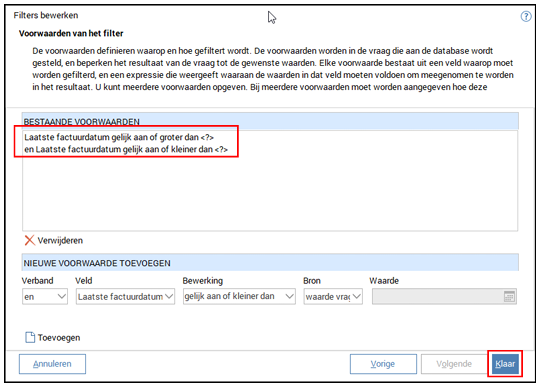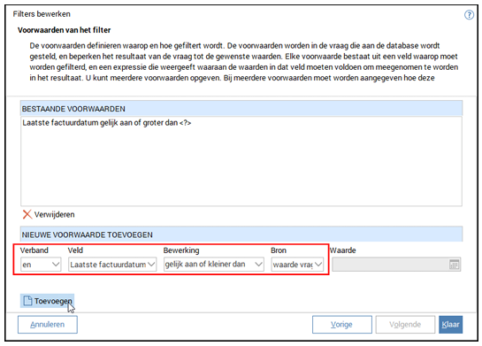 Voeg nu een tweede regel toe met Laatste factuurdatum – gelijk aan of kleiner dan – waarde vragen bij toepassen. Klik weer op Toevoegen.