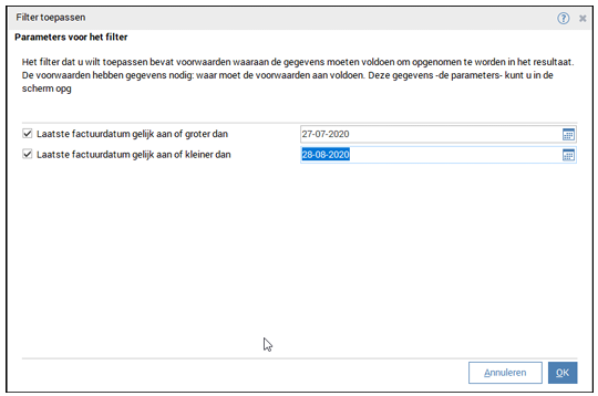 Je kunt klanten met een filter uitselecteren op diverse kenmerken, een van die kenmerken is de laatste factuurdatum.