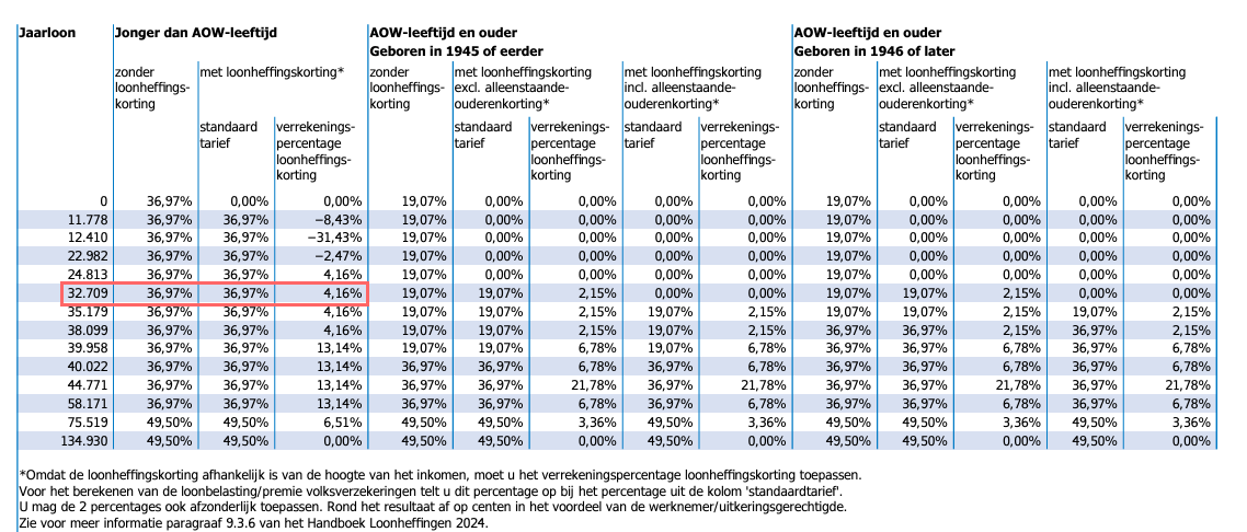 Kandidaat Lenie heeft vorig jaar 8 weken gewerkt en 4000 euro verdiend. Het verwachte jaarloon wordt dan 4000/8 x 52 = 26.000 euro. Vervolgens kan je in de Witte tabel bijzondere beloning Nederland van de Belastingdienst opzoeken welk percentage er gehanteerd moet worden. In 2024 is dat (met loonheffingskorting) 36,97 + 4,16 = 41,13 %