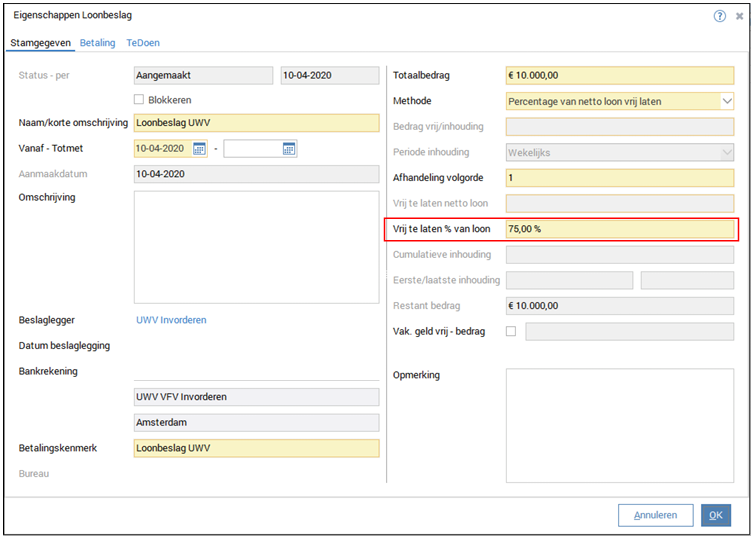 Hieronder een voorbeeld van een dergelijk loonbeslag met een percentage vrij te laten netto loon. In dit geval is het vrij te laten netto loon 75%. De netto vergoedingen die een kandidaat krijgt voor gemaakte kosten blijven hier buiten. Van het netto loon exclusief de netto vergoedingen zal dan 75% naar de kandidaat en 25% naar de beslaglegger gaan (gegeven het percentage in dit voorbeeld, andere percentages zijn uiteraard vrij in te stellen).