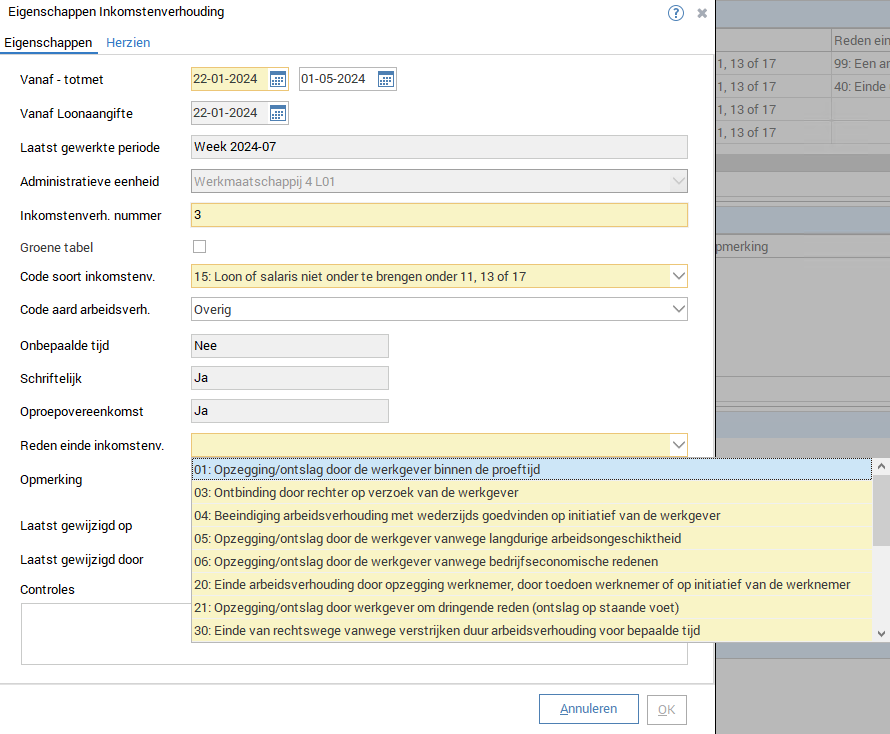 Als een kandidaat uit dienst gaat moet je met het beëindigen van de inkomstenverhouding een reden aangeven waarom de kandidaat uit dienst gaat. De Belastingdienst/UVW krijgt hiermee inzicht of er recht is op een uitkering en/of transitievergoeding.