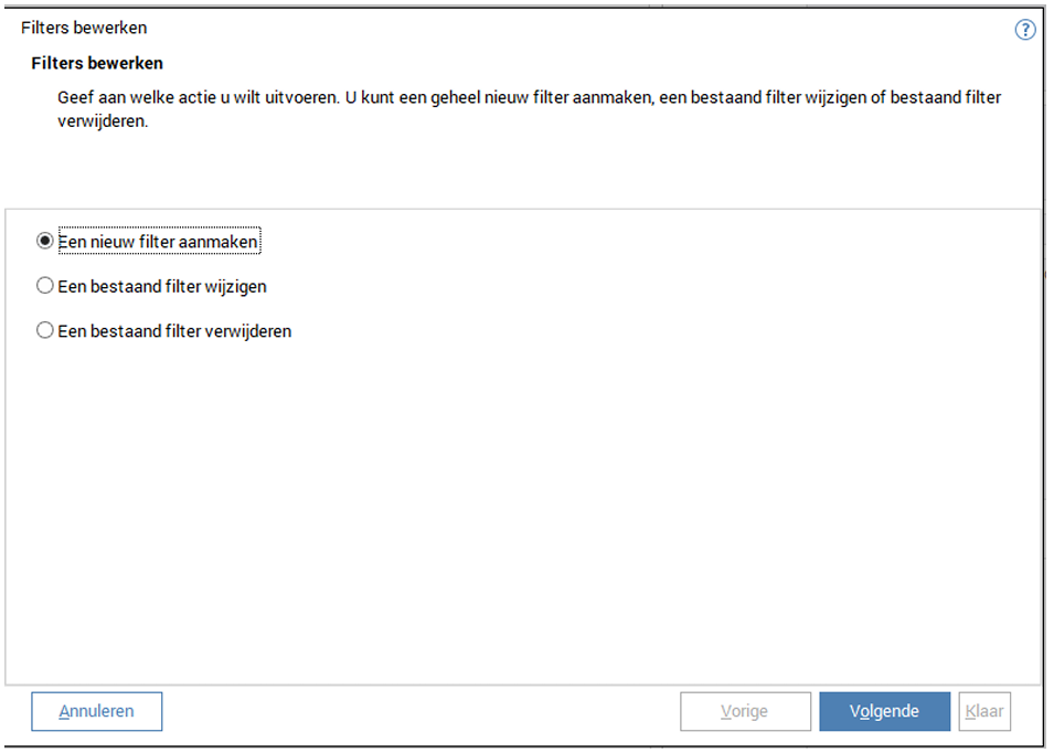Dit filter is ofwel al aanwezig in module Kandidaat (met F4 op te roepen, het filter heet dan “Laatst gewerkte week tussen <?> en <?>”) of je kunt ‘m zelf aanmaken. Dat werkt als volgt. Klik op dit icoon of toets Shift+Ctrl+F4 tegelijk. Kies voor “Een nieuw filter aanmaken”.