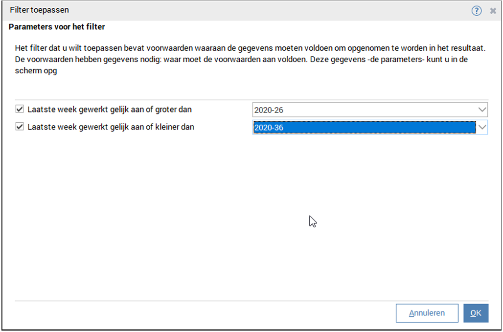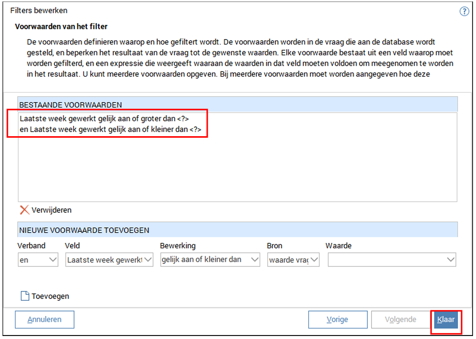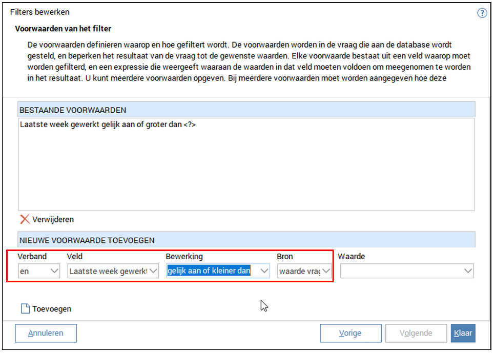 Voeg nu een tweede regel toe met Laatste week gewerkt – gelijk aan of kleiner dan – waarde vragen bij toepassen. Klik weer op Toevoegen.