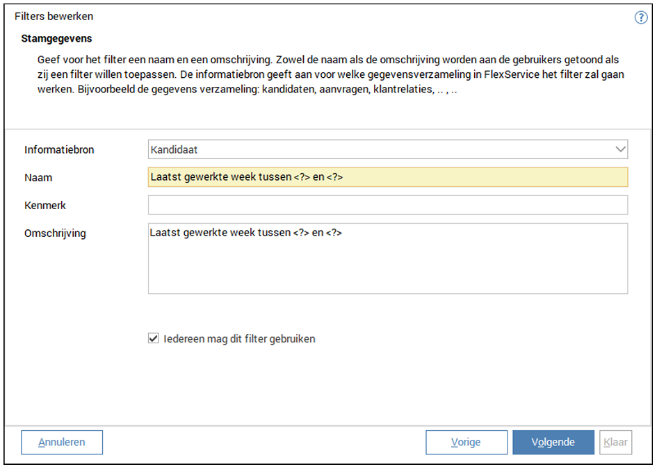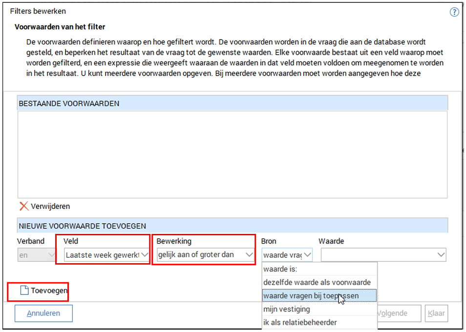 Stel nu het filter samen. Kies voor Laatste week gewerkt – gelijk aan of groter dan – waarde vragen bij toepassen. Klik op Toevoegen.