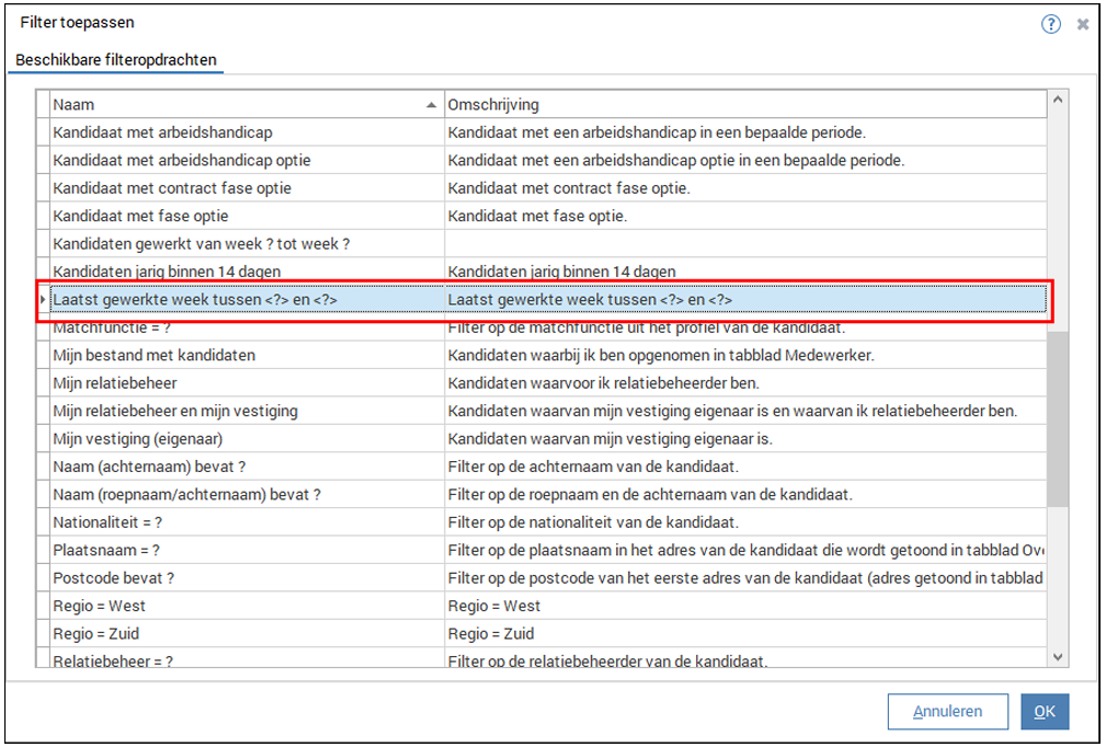 Je kunt kandidaten met een filter uitselecteren op diverse kenmerken, een van die kenmerken is de week waarin de kandidaat voor het laatst gewerkt heeft. Hierdoor kun je snel selecties maken van je actuele kandidaten die nu voor je werken (dus nog los van de status “Actief”, die in werkelijkheid achter kan lopen). Of je kunt analyseren wat je uitstroom is (dat zijn de kandidaten die in een bepaalde periode in het verleden voor het laatst gewerkt hebben).