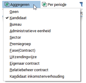 Een andere handige optie is om te Aggregeren. Standaard staat hij op ‘Kandidaat’, maar het kan ook heel interessant zijn om te aggregeren per Uitzendingwijze. Vaak wordt in de Uitzendingswijze het onderscheid gemaakt tussen Uitzenden en Payroll, en met de WAB is dat toch een hele interessant om naar te kijken. Welk deel van je SVW loon zit in Payroll?