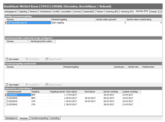 In FlexService worden de inkomstenverhoudingen getoond bij de kandidaat in het tabblad Rechten (BO/FO) ondertab Pensioen.