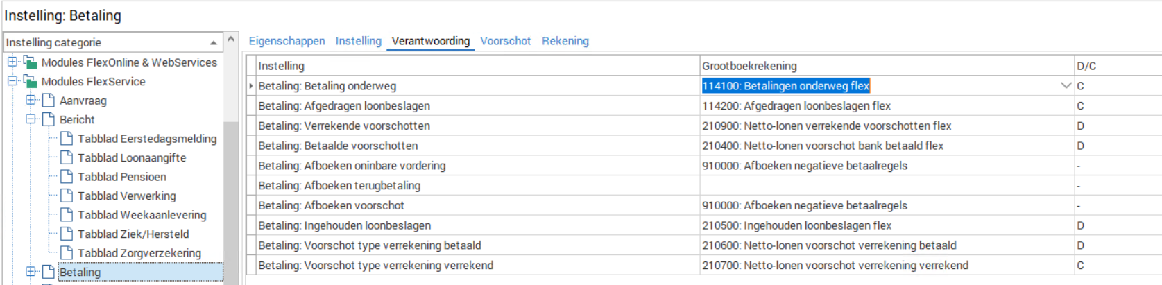 Het grootboek “betalingen onderweg” wordt ingesteld in de FlexAdministrator, Instelling, modules FlexService, Module betaling, tab Verantwoording.