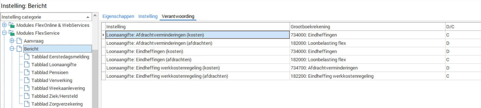 Het is mogelijk om de ouderenkorting te verantwoorden naar het boekhoudpakket. Dit kan worden ingesteld in de FlexAdministrator bij Instelling Modules FlexService - Bericht - tabblad Verantwoording. Hier kunnen grootboekrekeningen worden gekoppeld aan de afdrachtsverminderingen, eindheffingen en ouderen kortingen, die tijdens de verwerking van de loonaangifte worden berekend.