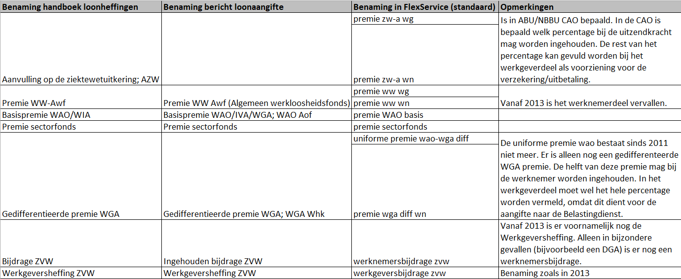 Zie hieronder in de afbeelding welke premie wordt bedoeld en hoe deze (verschillend) benoemd worden bij de Belastingdienst, het Loonaangiftebericht en FlexService.