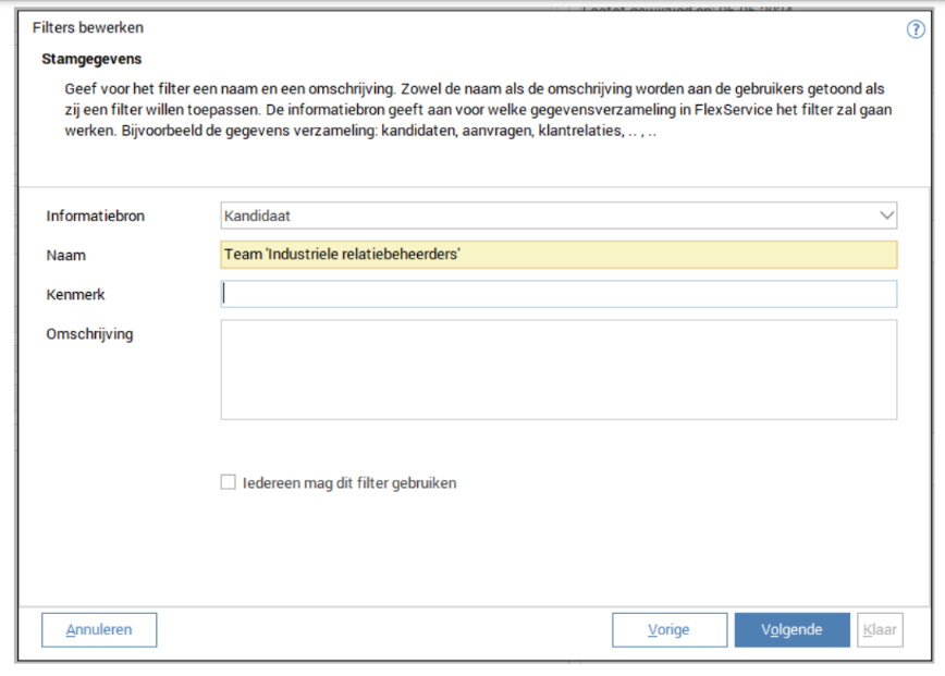 Je maakt een nieuw filter aan met daarin voorgedefinieerd de personen. Bijvoorbeeld alle kandidaten van Team 'Industriële relatiebeheerders' met daarin Gebruiker en Medewerker: