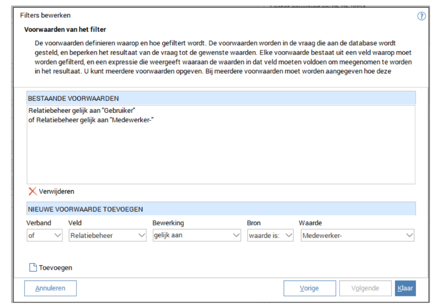 Let op dat je kiest voor verband 'of'! Als je 'en' gebruikt werkt het filter niet!