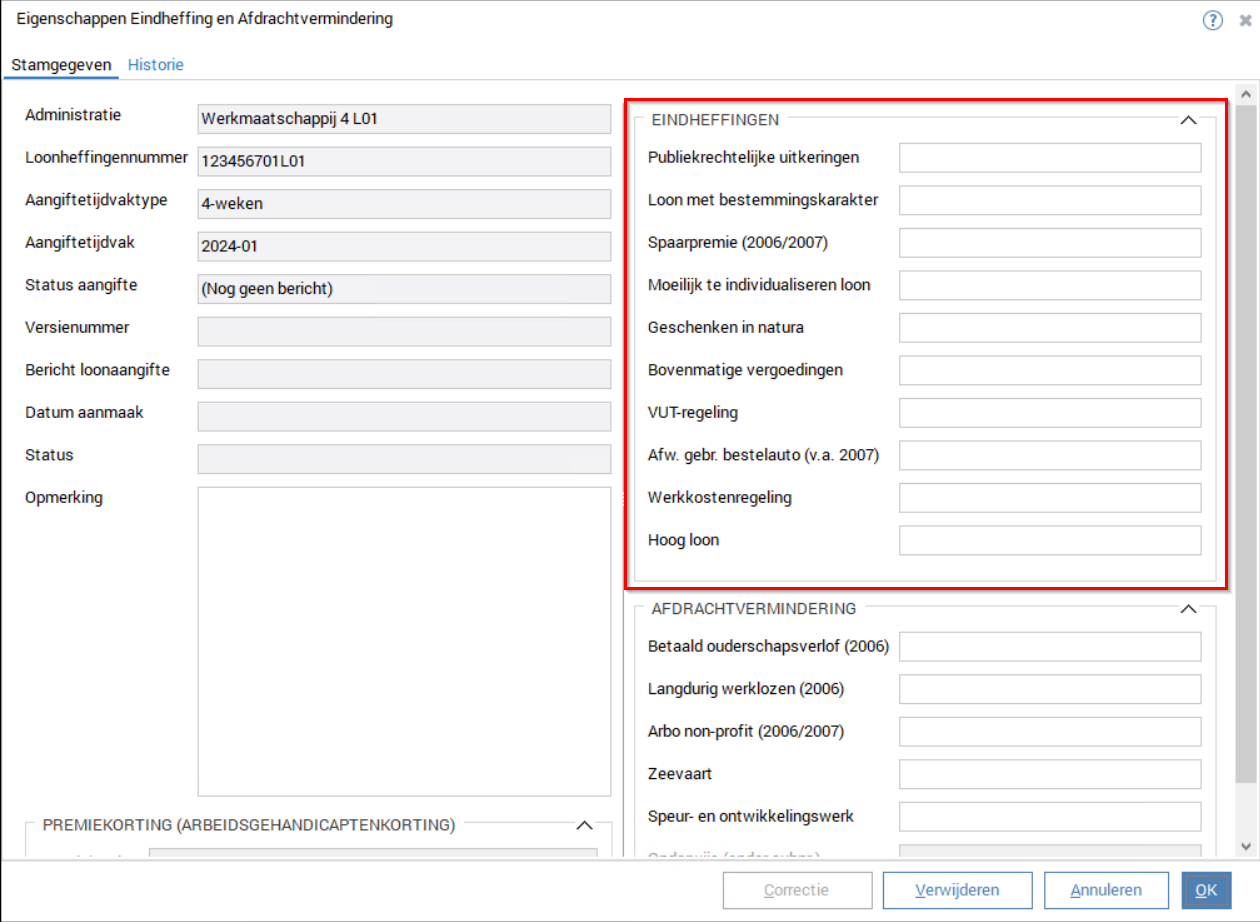 Om te bepalen wat de eindheffing zal zijn en onder welk kopje het valt, dient u het handboek loonheffingen te raadplegen. Daarin staan de verschillende methoden en berekeningswijzen. Let wel; u dient de berekening zelf uit te voeren, waarbij u het bedrag dat in de eindheffing verrekend moet worden invult in het Eindheffingenscherm.