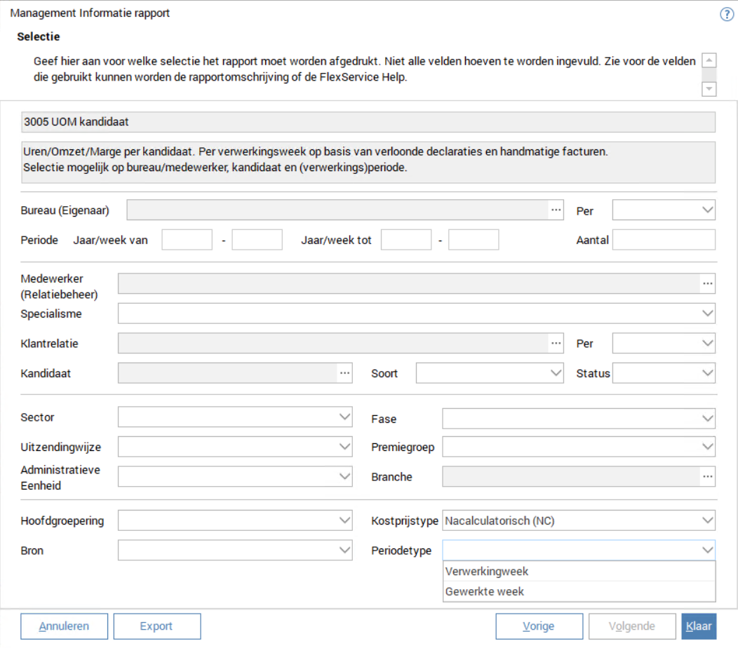 Om te kiezen voor gewerkte of verwerkingsweek kies je na het kiezen van het benodigde rapport in het selectievenster op de instelling "Periodetype": Gewerkte week of Verwerkingweek.