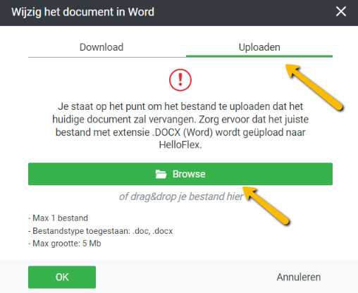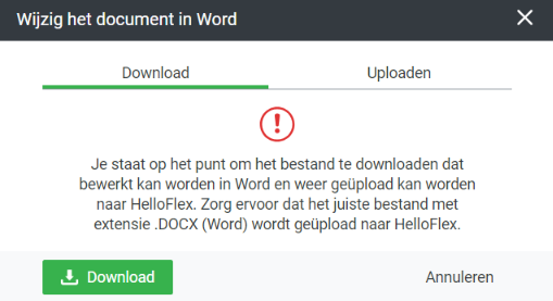 Je klikt dan op “Download” waarna het document zich opent buiten HelloFlex om in Word. Je kan het document dan wijzigen naar wens in het reguliere Word programma. Zodra je klaar bent met het wijzigen van het document klik je op “Uploaden” en kun je het nieuwe bestand hier toevoegen: