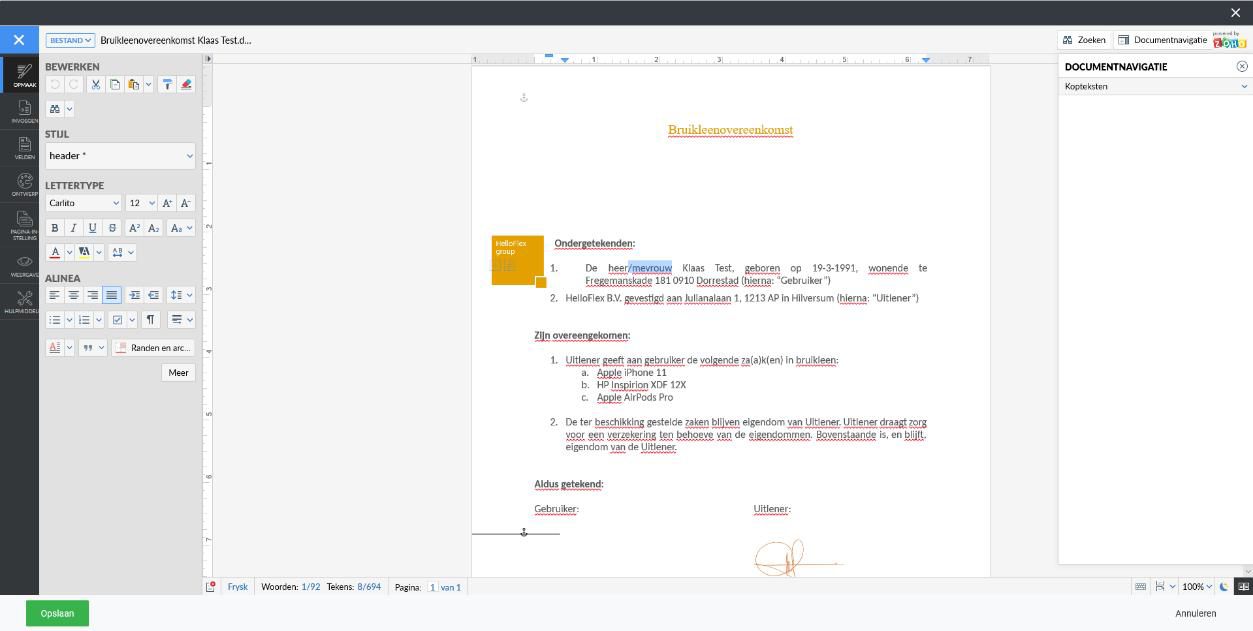 Nadat je het document hebt aangepast, druk je linksonder op 'Opslaan' en het document zal aangepast worden aangeboden aan de kandidaat en of de opdrachtgever.