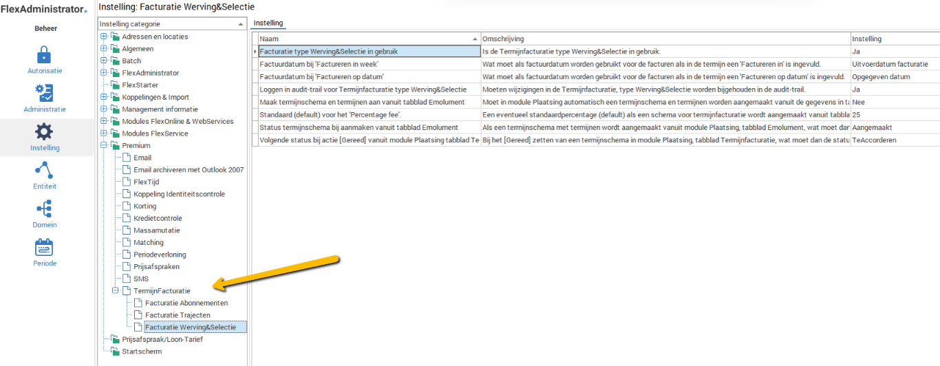 Deze kan je vinden in FlexAdministrator onder Instelling > Premium > Termijnfacturatie.