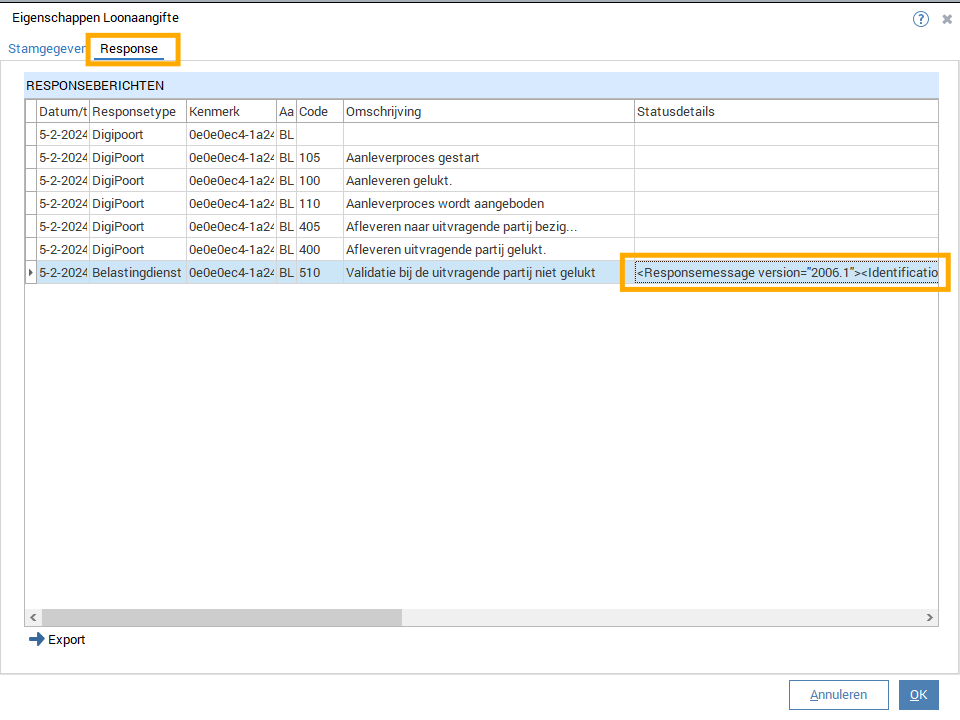 Om te controleren wat de gegevensfout precies inhoud, kan de regel worden geselecteerd en klik je hierna op de knop "Controles". Indien dit niet duidelijk genoeg is, dan kun je ook op "eigenschappen" klikken en dan op de tab "response". Je kunt hier in de statusdetails de exacte fout terugvinden. Mocht de regel niet volledig leesbaar zijn dan kunnen de gegevens door middel van de knop "Export" worden geëxporteerd naar Excel. Hier is de volledige regel altijd zichtbaar.