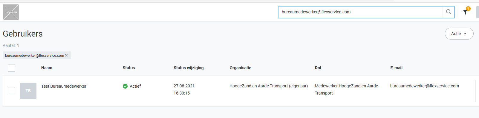 Het kan zijn dat er al een medewerker bekend is met dit e-mailadres maar bijvoorbeeld ook dat er een kandidaat is met dit e-mailadres. Om hier achter te komen ga je in HelloFlex naar Admin en vervolgens Gebruikers en zoek je op het e-mailadres: