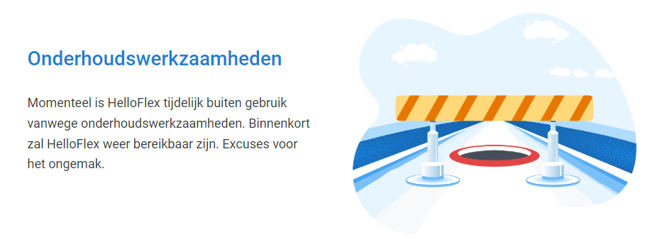 Vanaf het moment dat de instelling actief is (en de toegang tot HelloFlex dus uit staat), dan krijgen bureaugebruikers, opdrachtgevers en kandidaten na het inloggen een scherm te zien dat er onderhoud is aan de omgeving.