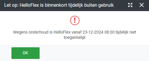 Tussen het activeren van de instelling en het moment dat de HelloFlex-toegang daadwerkelijk uitgaat worden bureaugebruikers, opdrachtgevers en kandidaten gewaarschuwd. Zo krijgen ze na het inloggen eenmalig een pop-up venster waarin staat dat HelloFlex vanaf moment X niet beschikbaar is vanwege onderhoud. Deze melding is maximaal 24 uur voor het uitschakelen van HelloFlex te zien.