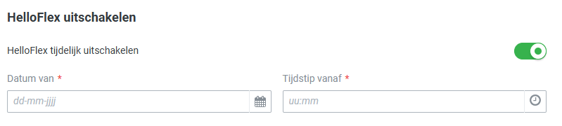 Bij activeren van de instelling verschijnt een datum en tijd veld. Deze moet minimaal 10 minuten vooruit worden ingesteld. Dat wil zeggen dat als je de instelling NU activeert, HelloFlex nog 10 minuten beschikbaar zal zijn voor alle gebruikers, met uitzondering van de Customer Admin. Er is geen maximum tijd vooruit dat deze instelling kan worden geactiveerd.