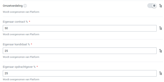 Ga naar de sectie ‘Contract-instellingen’ → ‘Omzetverdeling’. De instellingen worden automatisch overgeërfd door onderliggende bureaus en opdrachtgevers.