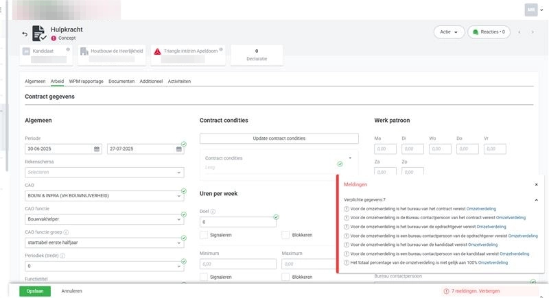 - Wanneer een contract wordt gekopieerd voor dezelfde kandidaat, wordt de omzetverdeling (RD) overgenomen uit het broncontract.