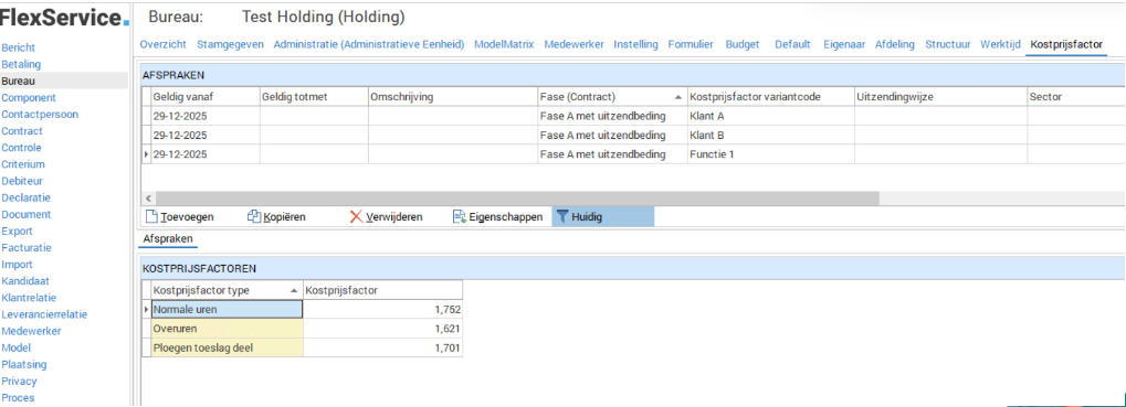 Het is mogelijk om op bureauniveau kostprijsfactoren in te richten. Deze kostprijsfactoren zijn leidend ten opzichte van kostprijsfactoren uit de componentmodellen.