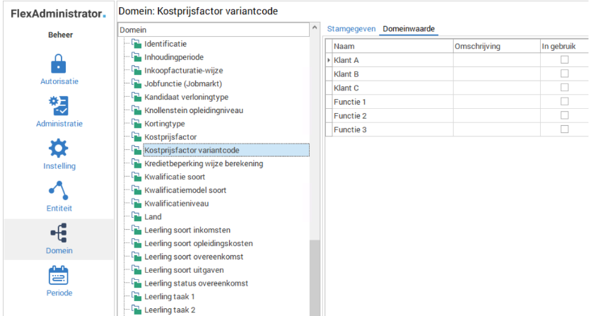 De variantcodes voor de kostprijsfactoren kan je vinden in de FlexAdministrator onder Domein --> 'Prijsafspraak Variantcode' --> tabblad 'Domeinwaarde'.