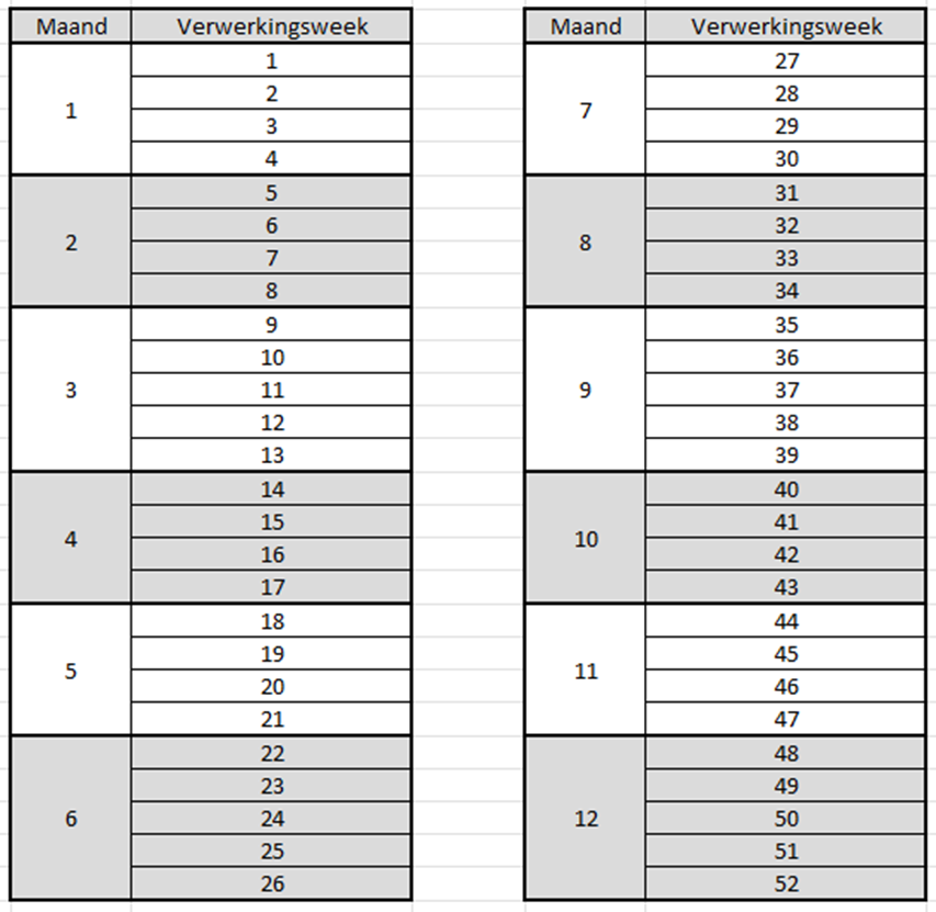 In onderstaand schema is terug te vinden welke verwerkingsweken in welke Maandaangifte worden meegenomen. Het is dus van belang om de verwerkingsweek goed in de gaten te houden bij de verloningen.