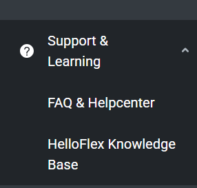 Je kan de Knowledge Base benaderen door de module Support & Learning onderaan het HelloFlex menu open te vouwen.